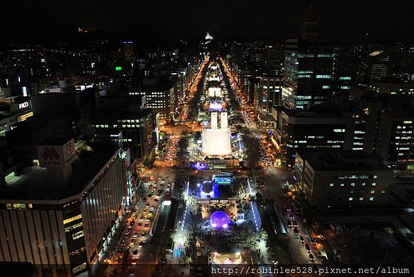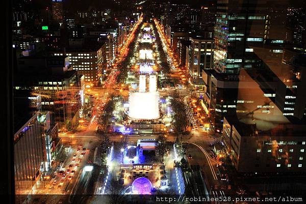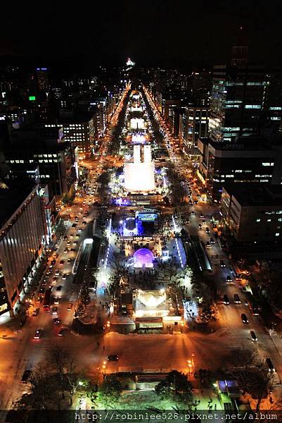 空中俯瞰帶狀的大通公園同時也是雪祭主會場,五光十色燈火通明。
