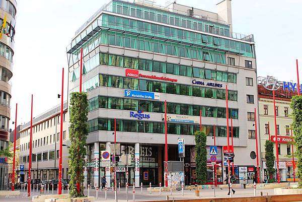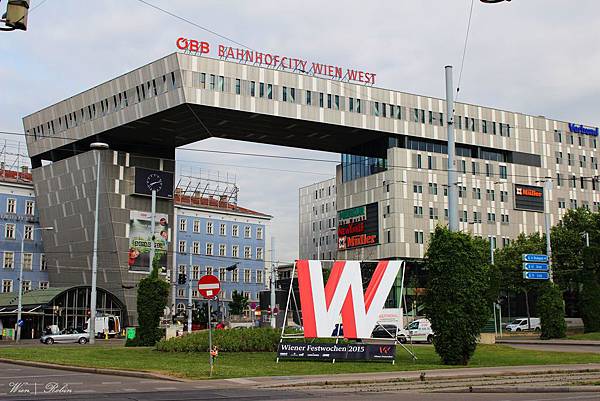 維也納西站OBB(奧地利國鐵)大樓,維也納德語拼字為"Wien",因此[W]便是維也納的象徵。