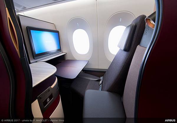 空間感優異,更勝主要競爭對手787,雖然不像787擁有酷炫的電子變色遮光簾,但A35K號稱每個靠窗座都有窗戶,杜絕missing window,窗戶尺寸也比傳統機型加大不少,商務艙Qsuite還選配了電動遮光板。