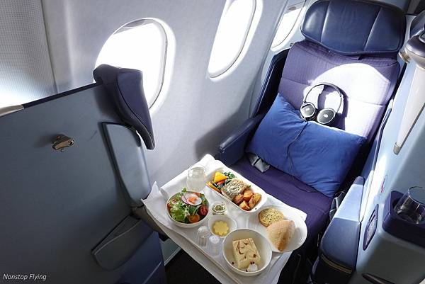 整個商務艙餐飲服務流程個人覺得稍嫌冗長,不算豪華豐盛的內容,除了沙嗲外就是一整個tray上來,但花了有點長的時間,所幸台馬之間的航程足夠吃飽後還能休息一會兒。座椅可全平躺,有點窄但區域航線休息很堪用了,可惜毛毯質料很薄觸感不佳幾乎就是業界經濟艙的毛毯等級。餐後組員巡迴發送[多喝水]瓶水。