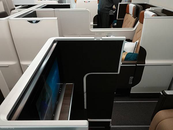 雖然沒有拉門,但整個座椅隔板的包覆性大幅提升隱私感,尤其是靠窗的A、K座位,升起與隔壁的隔板後,幾乎擁有絕佳隱私,同樣配備類似這種商務艙座位的還有日航和韓航。