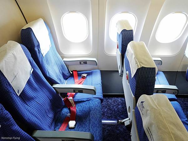 椅距大約31”,以1小時出頭航程來說蠻足夠的,加上座椅本身材質和設計,坐起來很舒服。